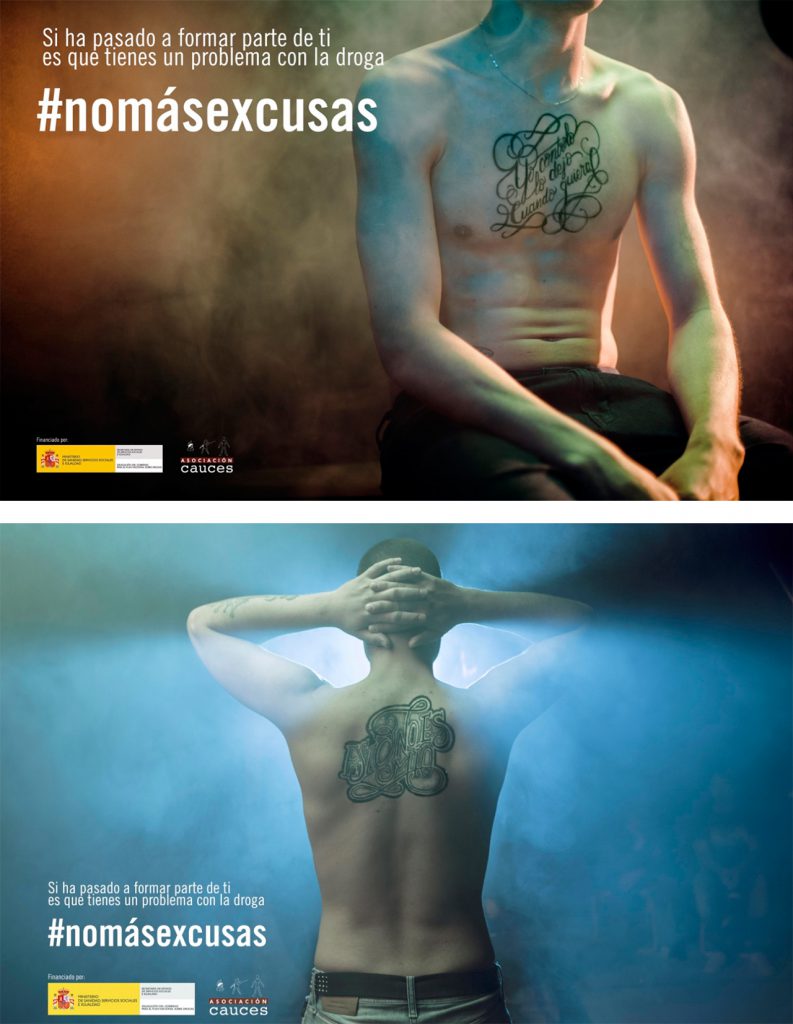 De esta forma estos chicos y chicas crearon una campaña de publicidad con muchísimo recorrido, que hablaba de ellos mismos, y que a su vez protagonizaban. La campaña incluía pieza audiovisual, cartelería, cuña de radio y difusión en redes sociales. Había frases que se repetían continuamente en el mundo de la droga como «yo controlo», «lo dejo cuando quiera», etc. La campaña decía que lo habías dicho tantas veces que había empezado a formar parte de ti, que ya había perdido el sentido. Para eso se creó una imagen visual en la que los chicos se tatuaban esas excusas que tantas veces habían dicho. Ya formaban parte de ellos, ya no eran excusas, sino tanta mentira como el mundo que los rodeaba.